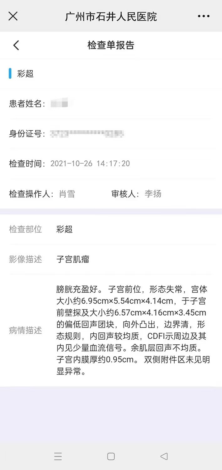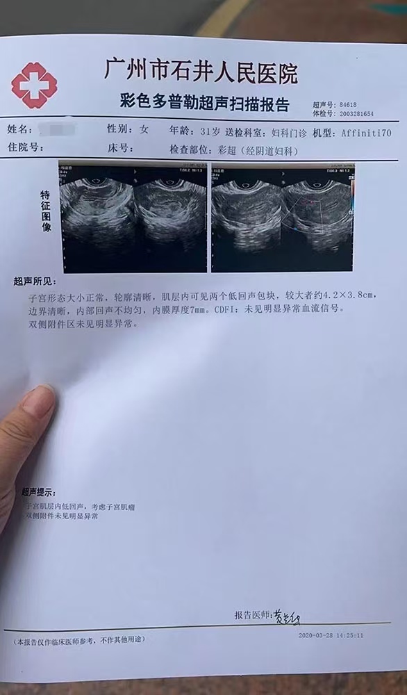 20年3月的时候,月经来了半个月还没完全停,痛经的时候都没法直起腰上课,直接请了病假去医院检查,结果是子宫肌瘤,有两个,最大的有已经4.2公分了,我当时还不了解这是什么病,医生说这是在子宫里长的肌瘤,不用担心,先吃点看看,再大手术切除肌瘤就行了,手术再小也伤人,我不想手术,医生给我开了桂枝茯苓胶囊,还让我定期检查,看着医生没当回事的样子,拿着药就回家了。